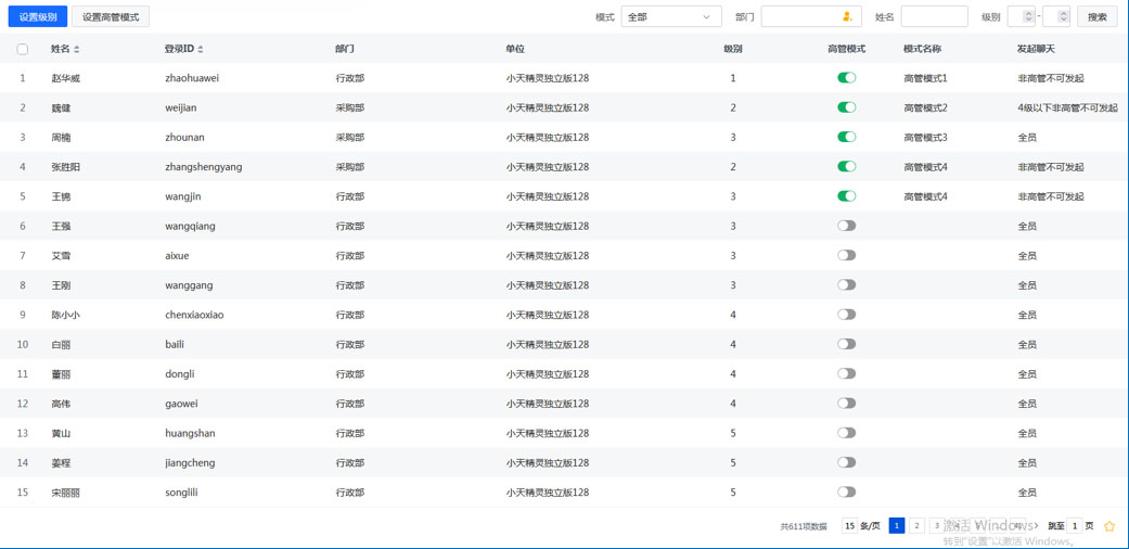 高管模式:企业组织越大,人员就越多,很多企业采用上下级管理制度,这就导致非直接上下级一般不会进行直接沟通。在即时通讯系统中,需要支持这种制度,建立高管模式,自动指定谁跟谁能直接沟通。对于不能直接沟通的人员,可以互加好友进行沟通。