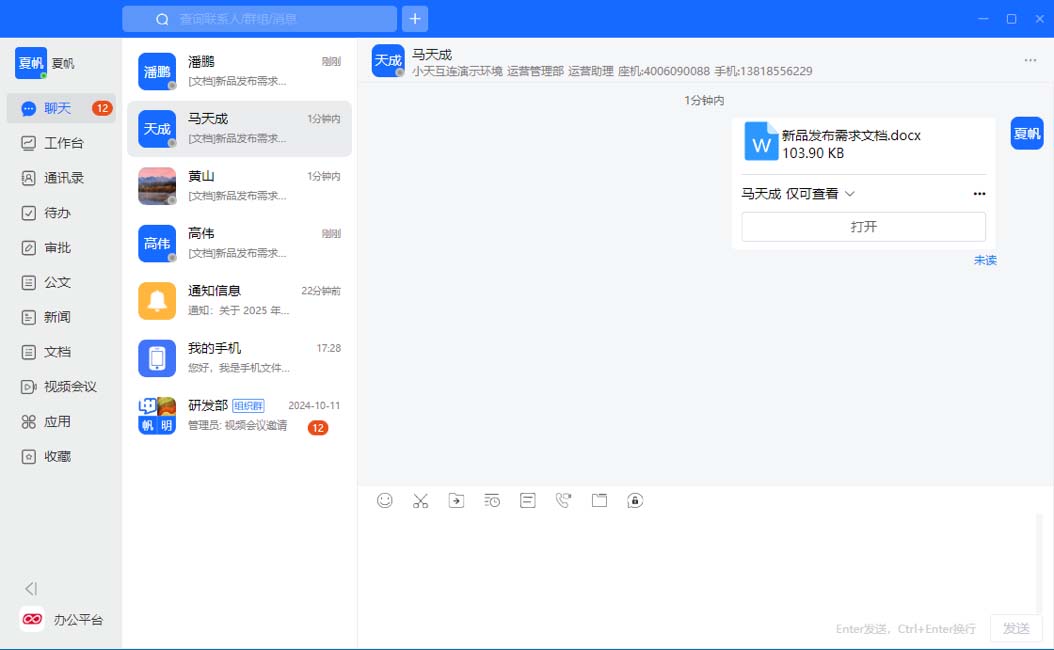 不是所有的员工都能够访问系统中的所有数据和使用全部的功能,因此必须建立严格的访问控制和权限管理体系。根据员工的职位、部门和工作职责,为其分配相应的权限。例如,普通员工只能查看和编辑与自己工作相关的文件和聊天记录,而管理层则可以访问更多的业务数据和系统设置。对于集成的不同的业务功能,更要按照业务所属范围划分人员、部门的查看及使用权限。