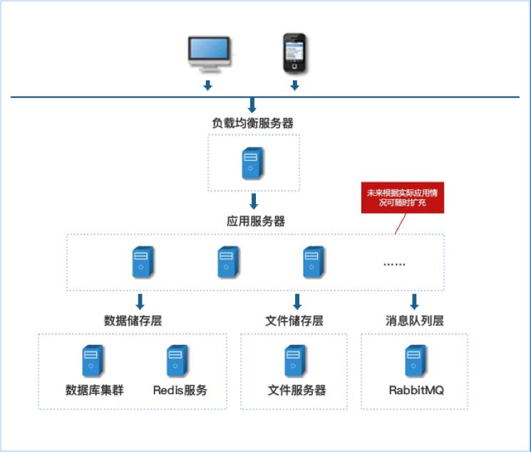 如果是负载均衡部署,服务器可以是实体服务器,也可以是云服务器,或者是实体服务器建立的虚拟服务器。通常,对于负载均衡部署方式,我们需要:Ngnix服务器、应用服务器、数据库服务器、Redis服务器、文件服务器以及消息服务器。