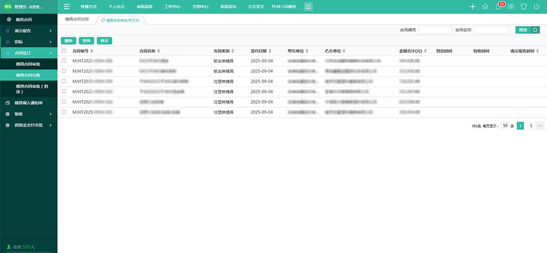模具合同管理模块专门用于管理与模具相关的合同。它包括合同请示报告、招标、合同签订、模具调入通知、验收以及质保金支付等功能。这个模块帮助企业跟踪模具开发和采购的全过程,确保模具质量和交付时间,同时管理与模具相关的财务事务。