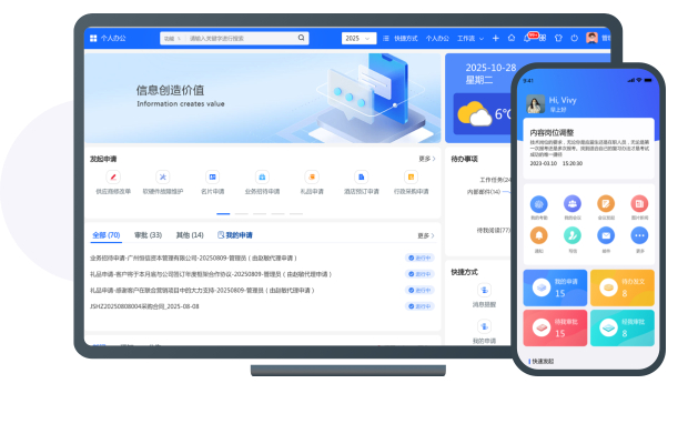 统一门户(工作台):简单方便,一个门户解决所有问题,支持场景化自定义门户和个性化设置。