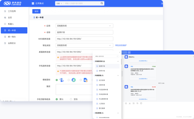 应用申请管理: 对应用的申请入口进行管理,维护申请入口的图标,访问位置以及申请入口的链接,快速实现申请入口的集成。