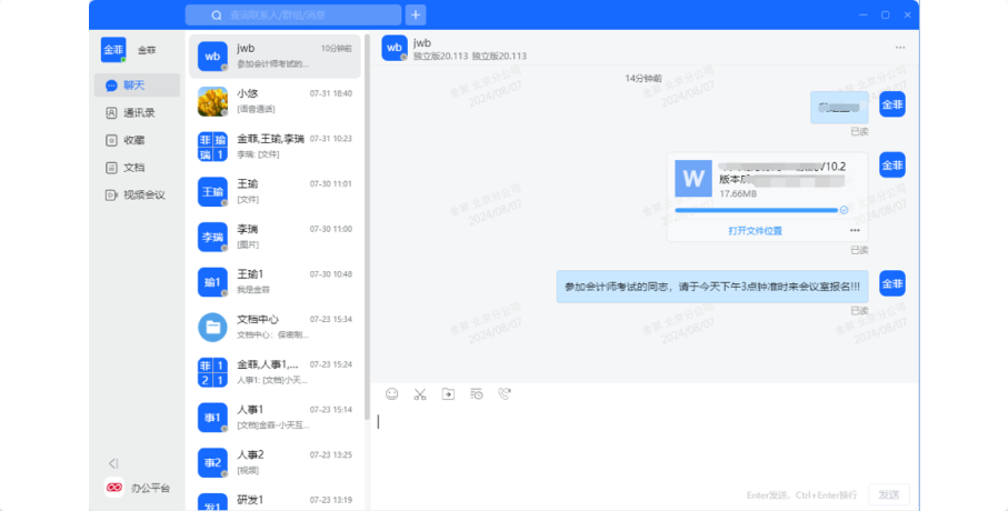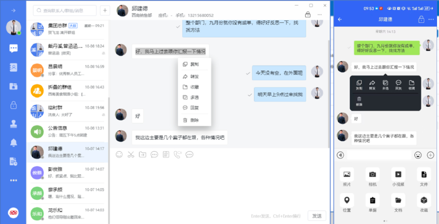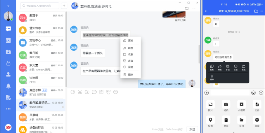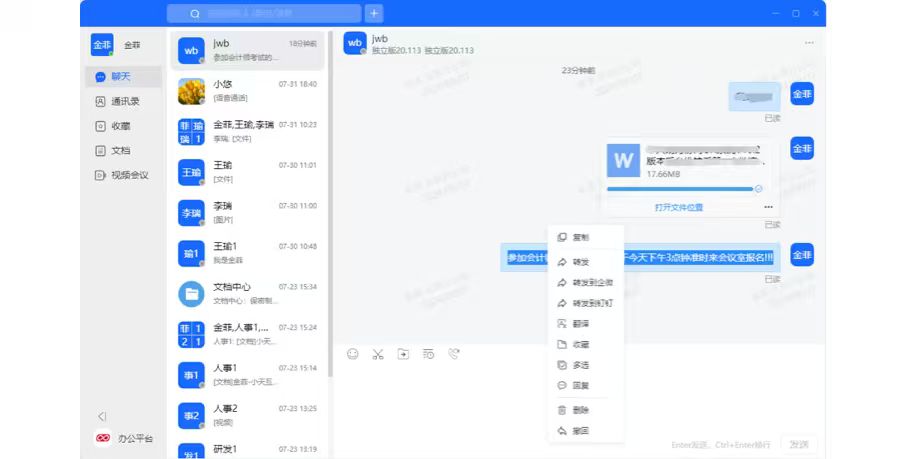 支持对消息进行复制,转发,收藏,合并转发,回复,删除等常规操作。具有已阅标记,在群聊时能够查看阅读记录