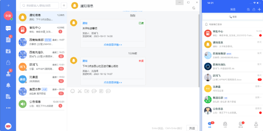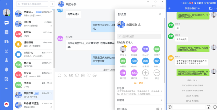 支持组建500人以上的大群,群内人员实名,方便消息快速上通下达。考虑大群管理和消息量集中的问题,保证消息触达率100%的前提下,进行了专业级的优化措施,千人群至万人群均可沟通流畅。