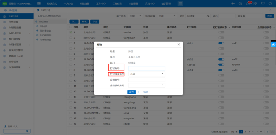 要想将通讯消息同步发送到钉钉、企微中,就需要进行账号绑定,系统提供企微、钉钉批量用户账号绑定的功能。也支持对单个用户账号进行设置。